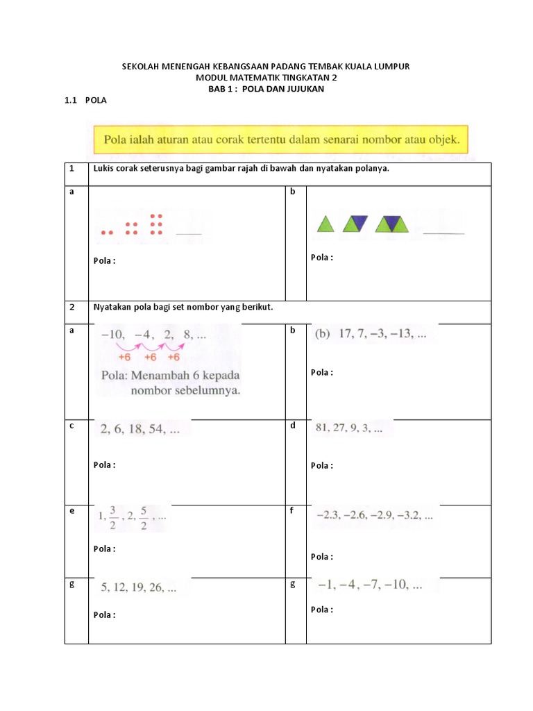 Latihan matematik tingkatan 2 bab 1 pola dan jujukan. Pola dan jujukan pola nombor dan urutannya pola corak berulang 1 pola bagi jujukan nombor menggambarkan hubungan antara nombor nombor dalam suatu urutan. Pola dan jujukan duration. To play this quiz please finish editing it.