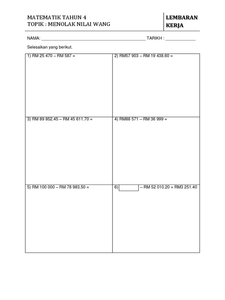 Soalan Matematik Wang Tahun 4 Kosong Kerja