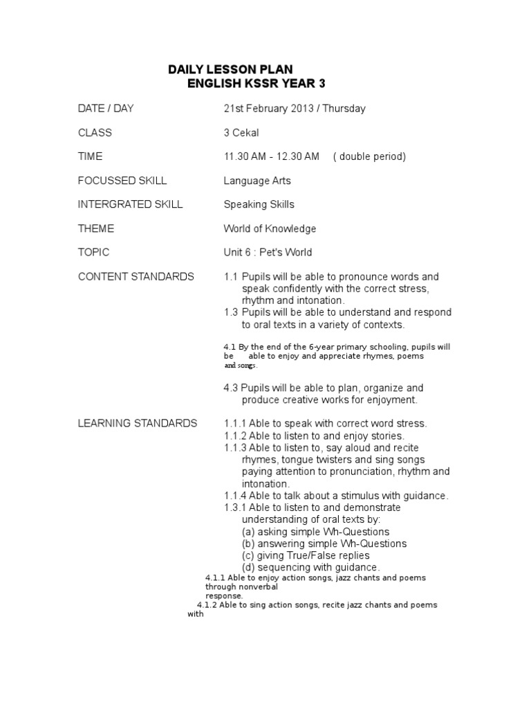 1 English Lesson Plan Year 3 Kssr Unit 4 Listening And Speaking Lesson Plan Question