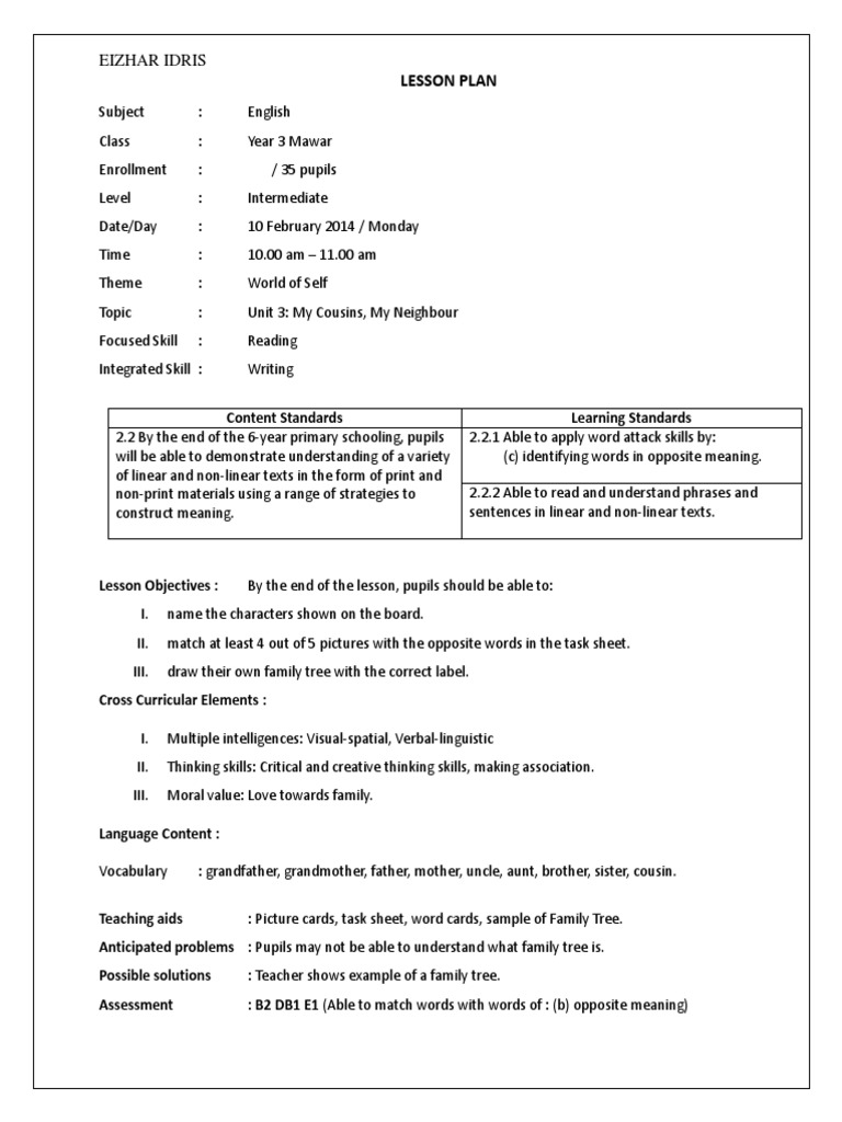 Lesson Plan Reading Kssr Lesson Plan Reading Process