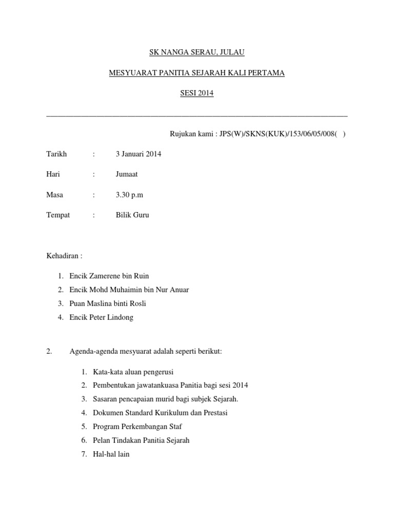 Contoh Minit Mesyuarat Panitia Sejarah Sekolah Rendah Kali Pertama