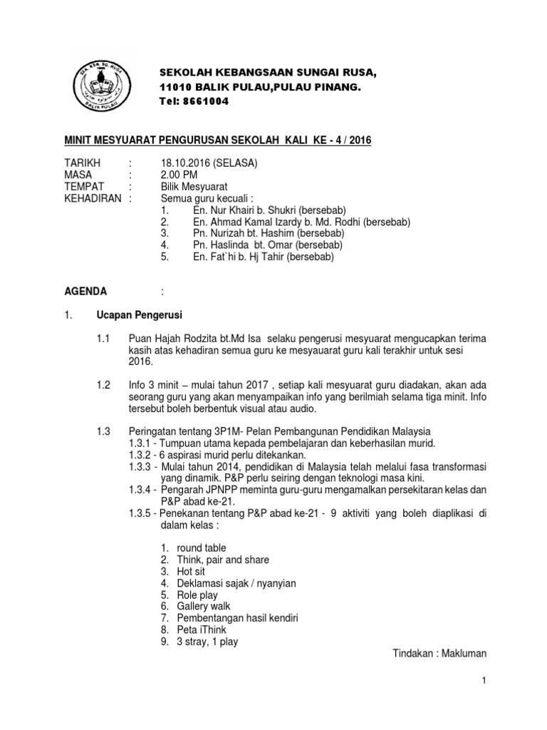 Minit Mesyuarat Pengurusan Pentadbiran Sekolah Bil 1 2019 Pages 1 4 Text Version Anyflip