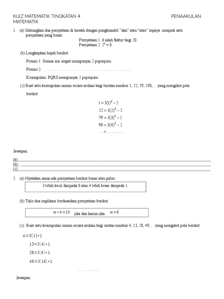 Kuiz Matematik Tingkatan 4 Penaakulan Matematik