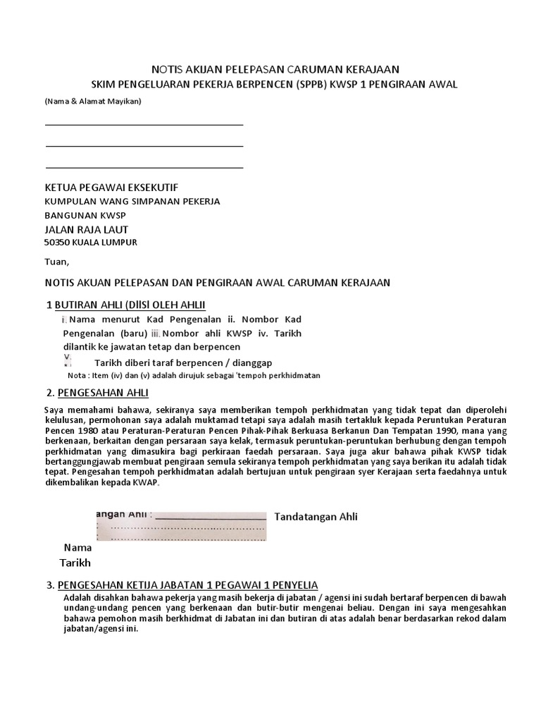 Notis Akuan Pelepasan Caruman Kerajaan Berhubung Dengan Pengeluaran Pekerja Berpencen Ppb Kwsp